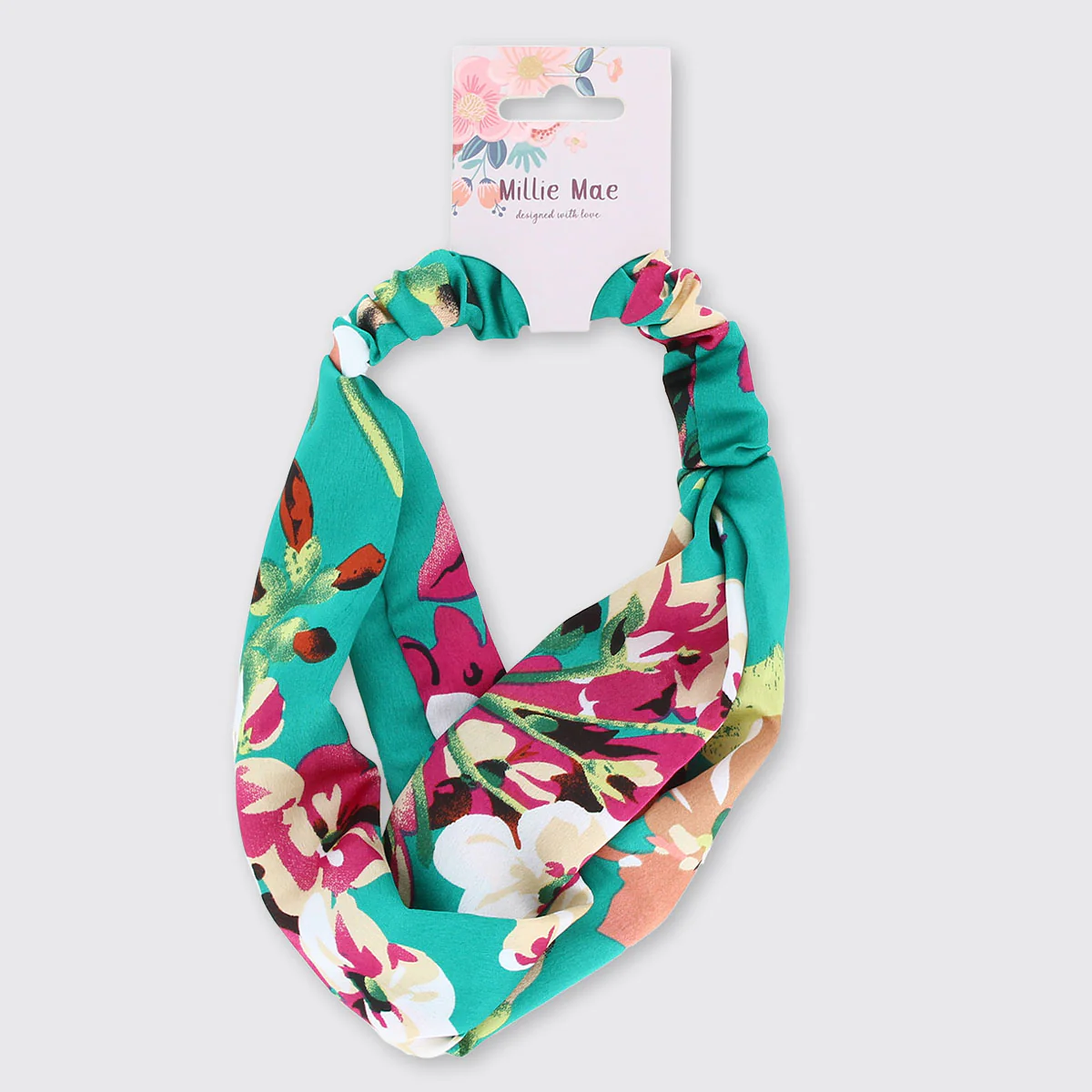 Our Soft Chloe Headband is the perfect accessory for adding a pop of colour to your outfit and make a great gift. Our Millie Mae headbands are handmade, hold hair securely and are very comfortable to wear. This Soft Headband features jade green florals and twist-front detailing.