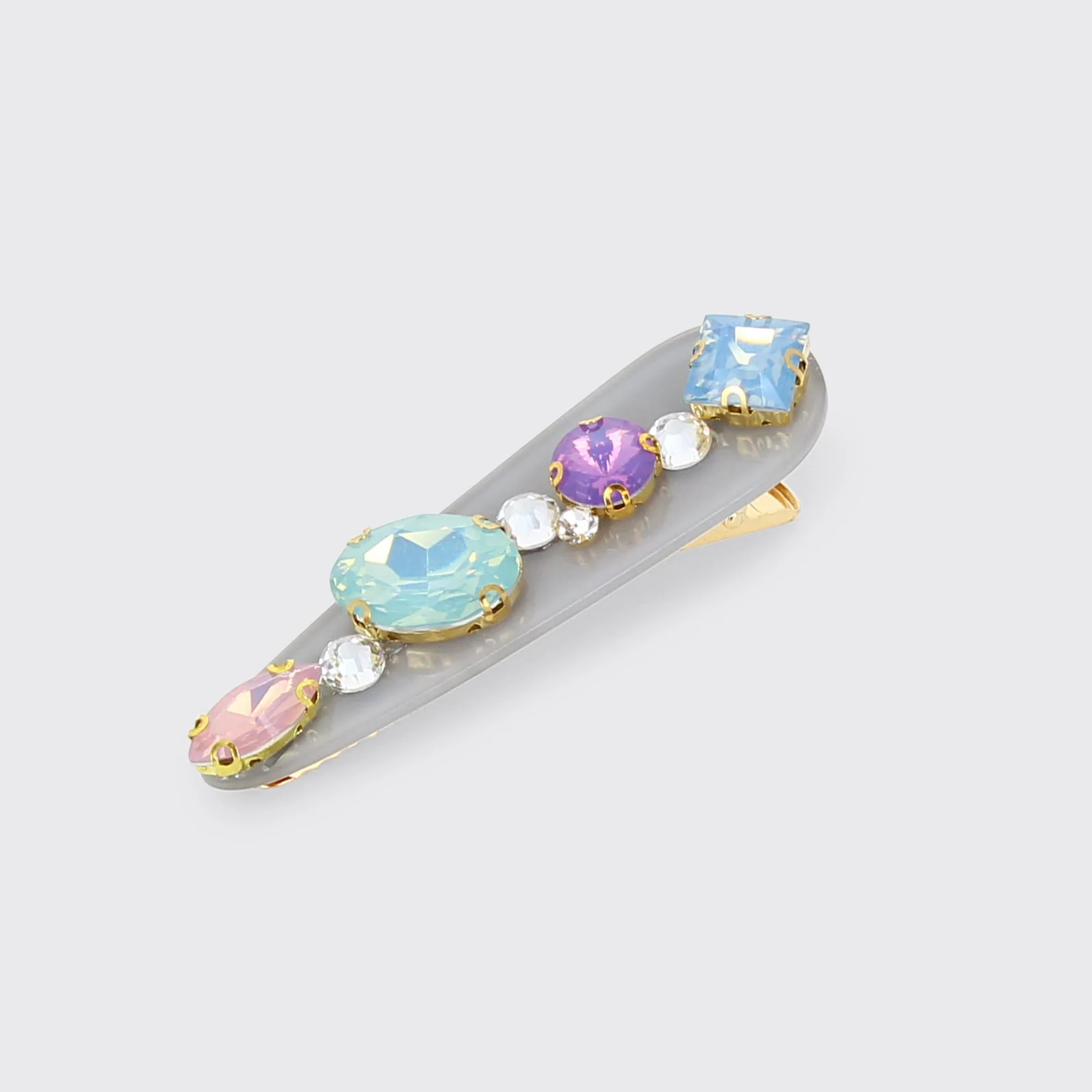 Elevate any hairstyle with our Jewelled Hair Clip. Featuring a lilac base and four gemstones, this clip sparkles with every movement.